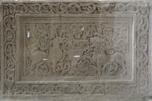 Transenna della scala della cripta. Un grifone e un leone che si fronteggiano fra tralci nascenti da un calice