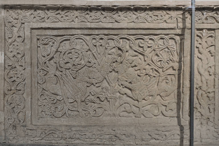 Transenna della scala della cripta. Due draghi con pesci in bocca che si fronteggiano fra tralci