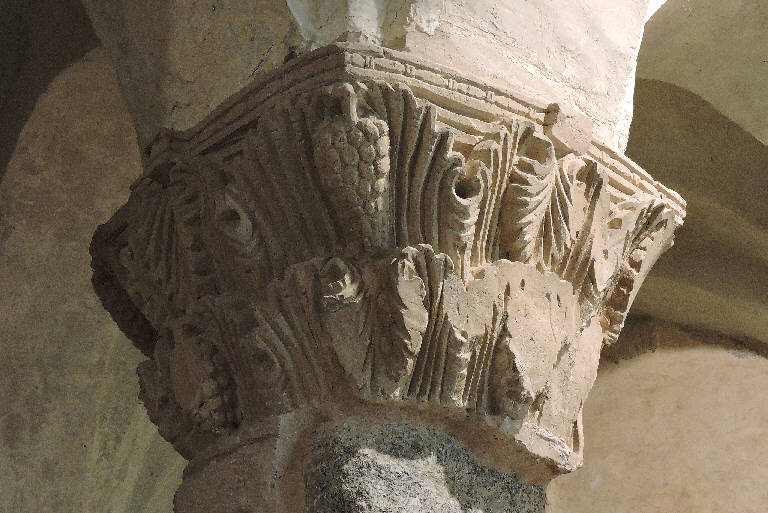 La cripta della chiesa di San Pietro al Monte, divisa in tre navate di quattro campate ciascuna, è coperta da volte a crociera impostate su sei colonne centrali in granito e dieci paraste in muratura poste lungo il perimetro. Sia le colonne che le paraste hanno capitelli decorati in stucco, in alcuni casi in parte o completamente caduto, proponenti ampie foglie d'acanto arricchite talvolta da copiosi grappoli d'uva. Probabilmente in origine anche tutte le colonne e le paraste erano avvolte da una decorazione in stucco che sopravvive ancora nelle due paraste dietro l'altare che esibiscono eleganti intrecci fitomorfi.