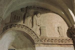 L'abside della cripta della chiesa di San Pietro al Monte presenta una decorazione in stucco costituita da tre altorilievi rappresentanti episodi della vita di Cristo e della Vergine. Nella campata di sinistra, nella lunetta in alto, è raffigurata la Presentazione di Gesù al tempio.