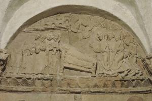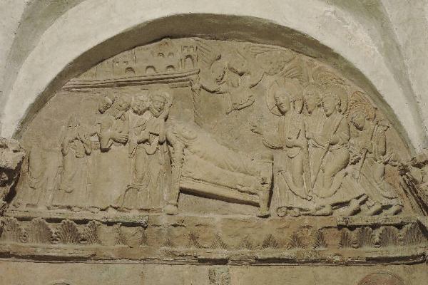 L'abside della cripta della chiesa di San Pietro al Monte presenta una decorazione in stucco costituita da tre altorilievi rappresentanti episodi della vita di Cristo e della Vergine. Nella campata centrale, nella lunetta in alto, è raffigurato il Transito della Madonna.