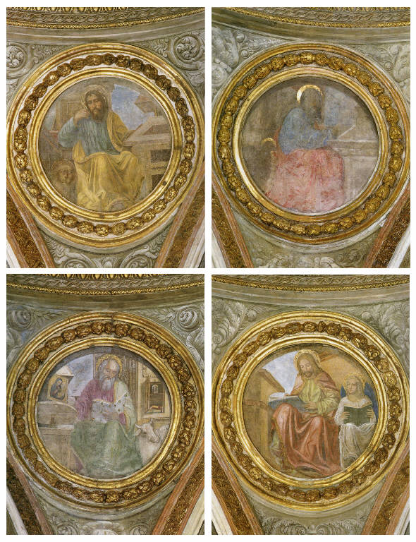 - NOTIZIE STORICO CRITICHE La cupola della chiesa di Santa Maria presso San Satiro, progettata e realizzata sotto la supervisione di Donato Bramante fra il 1482 e il 1486, fu decorata, stando ai documenti rinvenuti, da più artisti. Per l'apparato pittorico i nomi emersi dalla documentazione sono quelli di Pietro da Velate, Giovanni Pietro Rizzi, Giovanni Angelo Mirofoli da Seregno, Antonio Raimondi e Antonio da Pandino. Sappiamo infatti che il 28 agosto 1483 i deputati della Scuola di Santa Maria presso San Satiro e i pittori Pietro da Velate, Giovanni Pietro Rizzi e Giovanni Angelo Mirofoli da Seregno nominano i maestri Francesco da Vico e Antonio Raimondi arbitri nella vertenza intorno alla pittura dell'interno e dell'esterno del tiburio sopra l'altare maggiore di San Satiro e del tiburio grande della nuova chiesa. Il 7 maggio dello stesso anno Antonio Raimondi s'impegna a dipingere le volte del braccio destro del transetto e in novembre, il medesimo pittore e Antonio da Pandino, sono incaricati di dipingere in oro e azzurro tutta la volta e l'arco fra la vecchia chiesa di San Satiro e la nuova chiesa di Santa Maria, ovvero le volte del braccio sinistro del transetto.\nPer i tondi con i Quattro evangelisti dei pennacchi la critica ha riconosciuto la mano di un pittore bergognonesco dell'ultimo quarto del XV secolo. Fra i nomi emersi dalla documentazione c'è chi ha avanzato con maggior vigore quello di Antonio da Pandino. Nella letteratura artistica meno recente tali affreschi sono stati ritenuti anche opera di Bramantino o più in generale attribuiti a un pittore della sua cerchia.\nI Quattro evangelisti, ampiamente ritoccati negli interventi ottocenteschi e della prima metà del XX secolo, sono stati restaurati fra il 1985 e il 1987. Prima dell'intervento apparivano illeggibili nella loro raffigurazione a causa delle numerose infiltrazioni di acqua e delle conseguenti efflorescenze saline. Mentre è stato possibile recuperare i tondi con San Marco, San Luca e San Matteo, non si è potuto raggiungere un risultato analogo per il tondo con San Giovanni dove la gravità dei danni provocati dall'azione corrosiva dei sali ha reso la lettera iconografica dell'immagine alquanto sfocata. Fra il 1999 e il 2000 ulteriori interventi hanno interessato questi affreschi.