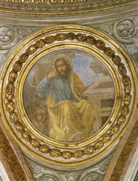 - NOTIZIE STORICO CRITICHE La cupola della chiesa di Santa Maria presso San Satiro, progettata e realizzata sotto la supervisione di Donato Bramante fra il 1482 e il 1486, fu decorata, stando ai documenti rinvenuti, da più artisti. Per l'apparato pittorico i nomi emersi dalla documentazione sono quelli di Pietro da Velate, Giovanni Pietro Rizzi, Giovanni Angelo Mirofoli da Seregno, Antonio Raimondi e Antonio da Pandino. Sappiamo infatti che il 28 agosto 1483 i deputati della Scuola di Santa Maria presso San Satiro e i pittori Pietro da Velate, Giovanni Pietro Rizzi e Giovanni Angelo Mirofoli da Seregno nominano i maestri Francesco da Vico e Antonio Raimondi arbitri nella vertenza intorno alla pittura dell'interno e dell'esterno del tiburio sopra l'altare maggiore di San Satiro e del tiburio grande della nuova chiesa. Il 7 maggio dello stesso anno Antonio Raimondi s'impegna a dipingere le volte del braccio destro del transetto e in novembre, il medesimo pittore e Antonio da Pandino, sono incaricati di dipingere in oro e azzurro tutta la volta e l'arco fra la vecchia chiesa di San Satiro e la nuova chiesa di Santa Maria, ovvero le volte del braccio sinistro del transetto.\nPer i tondi con i Quattro evangelisti dei pennacchi la critica ha riconosciuto la mano di un pittore bergognonesco dell'ultimo quarto del XV secolo. Fra i nomi emersi dalla documentazione c'è chi ha avanzato con maggior vigore quello di Antonio da Pandino. Nella letteratura artistica meno recente tali affreschi sono stati ritenuti anche opera di Bramantino o più in generale attribuiti a un pittore della sua cerchia.\nI Quattro evangelisti, ampiamente ritoccati negli interventi ottocenteschi e della prima metà del XX secolo, sono stati restaurati fra il 1985 e il 1987. Prima dell'intervento apparivano illeggibili nella loro raffigurazione a causa delle numerose infiltrazioni di acqua e delle conseguenti efflorescenze saline. Mentre è stato possibile recuperare i tondi con San Marco, San Luca e San Matteo, non si è potuto raggiungere un risultato analogo per il tondo con San Giovanni dove la gravità dei danni provocati dall'azione corrosiva dei sali ha reso la lettera iconografica dell'immagine alquanto sfocata. Fra il 1999 e il 2000 ulteriori interventi hanno interessato questi affreschi.