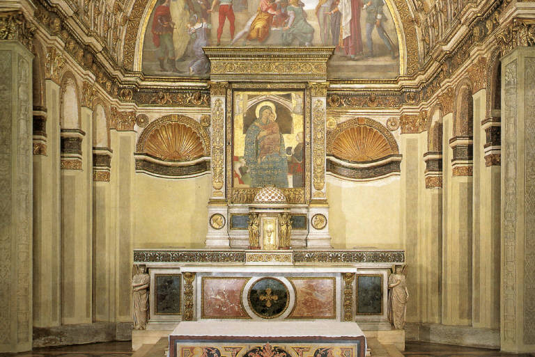 - NOTIZIE STORICO CRITICHE Il finto coro della chiesa di Santa Maria presso San Satiro fu progettato e verosimilmente realizzato da Donato Bramante contemporaneamente all'intera costruzione dell'edificio, dunque nel giro di anni fra il 1482 e il 1486. Infatti la struttura della finta prospettiva simula un prolungamento della navata centrale con la presenza di tre campate, con pilastri e archi, e suggerisce l'esistenza di navate minori laterali per mezzo di un ordine minore: tutto ciò poteva essere stato pensato solo contemporaneamente alla progettazione e realizzazione di quelle che sono le reali navate della chiesa.\nPer l'apparato decorativo del finto coro non è stata ritrovata documentazione specifica ma si può immaginare che gli artisti emersi dai contratti per l'ornamentazione delle altre parti della chiesa, come la cupola, le navate, il transetto, le volte e la sacrestia, si siano occupati, sotto il diretto controllo di Bramante, anche della realizzazione di questa decorazione. Ricordiamo che per l'apparato plastico i nomi emersi dai contratti sono quelli di Agostino Fonduli, Giovanni Battagio e Gabriele Battagio, mentre per l'apparato pittorico quelli di Pietro da Velate, Giovanni Pietro Rizzi, Giovanni Angelo Mirofoli da Seregno, Antonio Raimondi e Antonio da Pandino.\nNumerose campagne di restauro eseguite tra il XVII e il XX secolo hanno modificato notevolmente l'assetto decorativo originario della chiesa. Per quando concerne il finto coro sappiamo nello specifico che già nel 1693 venne attuato un rinnovamento della zona presbiteriale con la costruzione di un nuovo altare, di una nuova cornice per l'affresco votivo e di una nuova balaustra. Probabilmente in quell'occasione si procedette a restaurare anche lo sfondo prospettico fortemente deteriorato come riportano le visite pastorali del 1611 e del 1689. Lavori più radicali vennero però attuati fra il 1819 e il 1820 con il rifacimento della parte inferiore del finto coro e la costruzione di un nuovo altare. Per far fronte al fenomeno dell'umidità di risalita fu infatti realizzata un'intercapedine che isolasse gli intonaci dalla muratura. Ciò comportò, per evitare alterazioni nei piani prospettici, un assottigliamento del paramento murario e anche il conseguente rifacimento dei capitelli, delle cornici e della trabeazione. Per quanto riguarda gli intonaci e le decorazioni venne affidato al pittore Gaetano Vaccani nel 1819 l'incarico di un loro ripristino. Nello stesso anno il pittore Agostino Comerio rappresentò il Miracolo della Beata Vergine pugnalata da Massanzio nella grande lunetta che andò a sostituisce una rappresentazione più antica con Dio padre circondato da angeli. Nel 1820 si costruì il nuovo altare su progetto dell'architetto Felice Pizzagalli che fornì una nuova incorniciatura all'affresco duecentesco della Vergine con il Bambino. Negli anni 1937 e 1938 vennero attuati altri importanti lavori di restauro e consolidamento realizzati dall'architetto Gino Chierici. Si procedette infatti con opere di sottofondazione dell'intera parete, di cucitura delle lesioni e di ispessimento della muratura nella zona centrale del finto coro con lo spostamento dell'affresco della Vergine con il Bambino verso l'interno della chiesa di circa 20 cm. Contemporaneamente furono rinnovati gli intonaci e restaurate le decorazioni a candelabra delle lesene a opera del pittore Romildo Scaramuzza. Dopo altri interventi nel Dopoguerra agli intonaci, fra il 1983 e il 1992 è stata avviata una nuova campagna di restauro che ha portato a operazioni di pulizia e consolidamento e con la quale si è cercato di mantenere memoria, laddove possibile, anche dei vari restauri passati.