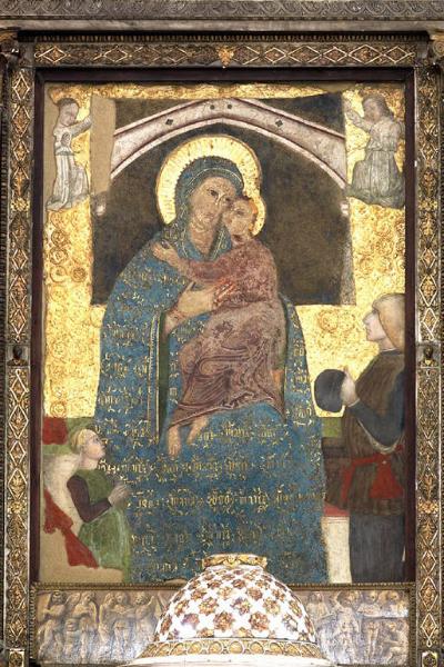L'altare maggiore della chiesa di Santa Maria presso San Satiro incornicia, nella parte superiore, l'affresco miracoloso della Vergine con il Bambino originariamente collocato all'esterno del sacello di San Satiro, sulla contrada del Falcone, e qui trasportato in seguito alla costruzione della nuova chiesa di Santa Maria. \nAl centro della rappresentazione è la Madonna con in braccio il bambino collocati sotto quelli che sembrerebbero i resti di un'architettura, forse un arco. In realtà ciò che possiamo scorgere oggi è il risultato di vari interventi successivi che hanno modificato i caratteri originari dell'opera. Infatti il manto azzurro della Madonna - dove ricorrono in oro le scritte MARIA e VIRGO -, le figure ai lati della scena - forse due donatori -, gli angeli in alto e lo sfondo in pastiglia dorata sono tutte aggiunte successive. Sulla gola e sulla mano della Madonna sono evidenti le tracce del sangue sgorgato miracolosamente a seguito della pugnalata.