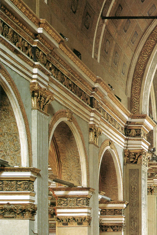- NOTIZIE STORICO CRITICHE La chiesa di Santa Maria presso San Satiro, progettata e realizzata sotto la supervisione di Donato Bramante almeno a partire dal 1482, fu decorata, stando ai documenti rinvenuti, da più artisti. \nPer l'apparato plastico decorativo i nomi emersi dalla documentazione diretta e indiretta sono quelli di Agostino Fonduli, Giovanni Battagio e Gabriele Battagio. Sappiamo infatti che l'11 marzo 1483 Agostino Fonduli s'impegna a realizzare, tra le varie opere fittili, anche una cornice in terracotta lunga 215 braccia (126,8 m): si tratta verosimilmente del fregio che corre lungo tutta la trabeazione maggiore della navata centrale e dei transetti. I fratelli Giovanni e Gabriele Battagio - il primo tra l'altro suocero di Fonduli - sono attestati in documenti del 1482 e 1483 come testimoni e nel 1487 Gabriele è pagato due volte per lavori non specificati alla chiesa: secondo la critica si tratterebbe probabilmente della realizzazione dei lacunari delle volte e della cupola dell'edificio se infatti lo stesso artista in un successivo contratto del 8 agosto 1500 accetterà di realizzare i lacunari in stucco della chiesa milanese di Santa Maria presso San Celso.\nNumerose campagne di restauro eseguite tra il XVII e il XX secolo hanno modificato notevolmente l'assetto decorativo originario della chiesa. Già la visita pastorale di Federico Borromeo nel 1611 sottolineava la cattiva condizione dell'intonaco dei pilastri "corrosi dalla vetustà". Nel 1686 sono infatti documentate le prime opere di restauro riguardanti il rifacimento degli intonaci e la realizzazione di nuove tinteggiature e dorature. Verso la fine del Seicento si pone mano alle pareti del transetto e agli inizi del secolo successivo si intraprendono lavori alle volte della navata maggiore e del transetto coprendo completamente con della pittura a calce tutte le decorazioni a cassettoni. Nel XIX secolo proseguono i restauri all'interno dell'edificio. Nello specifico nel 1830 i pittori Sandro Velzi e Carlo Fontana, dopo aver asportato tutto l'intonaco dalle volte, rifanno ad affresco le decorazioni sulla base dei motivi rinvenuti. Fra il 1832 e il 1834, su progetto di Felice Pizzagalli, si modificano le finestre nelle testate dei transetti aprendo le nuove luci di forma circolare. Fra il 1920 e il 1924, fra varie opere di risanamento, si realizza un nuovo restauro delle decorazioni e degli intonaci all'interno della chiesa. Dopo altri interventi nel Dopoguerra agli intonaci, fra il 1983 e il 1992 è stata avviata una nuova campagna di restauro che ha portato a operazioni di pulizia e consolidamento e con la quale si è cercato di mantenere memoria, laddove possibile, anche dei vari restauri passati.