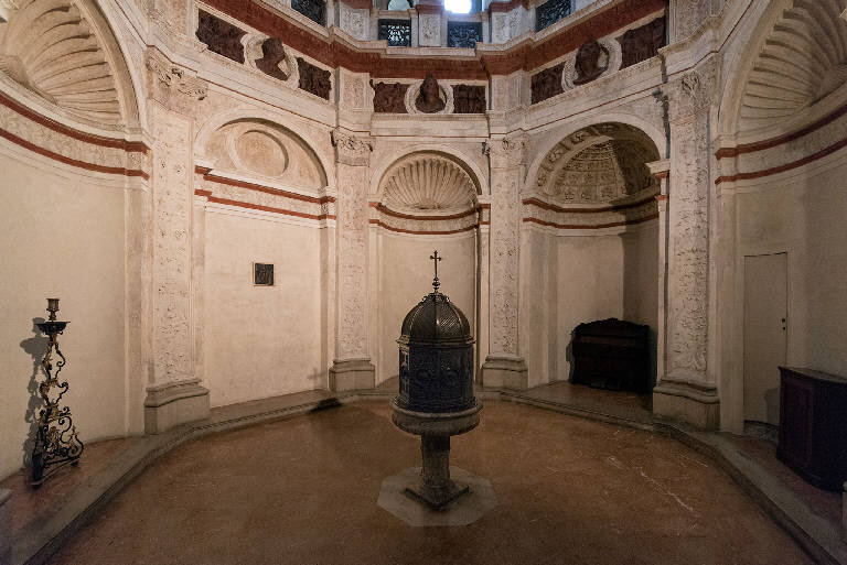 - NOTIZIE STORICO CRITICHE La sacrestia della chiesa di Santa Maria presso San Satiro fu progettata da Donato Bramante e realizzata sotto la supervisione dell'architetto almeno a partire dal 1482. Nel 1483 doveva essere certamente completata se, l'11 marzo di quell'anno, Agostino Fonduli s'impegna a realizzare, entro l'inizio del mese di maggio, un fregio grande composto da otto teste e sedici riquadri con putti: parte delle decorazioni fittili documentate del noto plasticatore per la chiesa milanese e unanimemente riconosciute dalla critica come elementi ornamentali da destinarsi alla sacrestia.\nAlcune trasformazioni all'ambiente sono state attuate nel corso del XIX secolo. Nel 1841 l'architetto Felice Pizzagalli si occupò della sistemazione dell'accesso, tamponando l'entrata originaria che dava verso locali attigui alla chiesa. Furono però del 1856 le modifiche più significative operate dall'architetto Giuseppe Vandoni in occasione dell'adattamento dell'antica sacrestia a battistero. Venne infatti in quell'occasione aperto un nuovo ingresso, sfondando una nicchia del lato nord-ovest, e creato un corridoio per collegare l'ambiente direttamente con la chiesa a livello della seconda campata della navata destra. All'interno furono sostituite da Paolo Gozzoli le originali basi in cotto con elementi in pietra di Viggiù e furono rifatte buona parte delle decorazioni delle lesene e degli intonaci delle nicchie. Nella parte superiore venne ricostruito il corridoio passante che si presentava parzialmente chiuso da murature, si rimaneggiò l'intonaco delle volte e si consolidò il lanternino. Nel 1857, dopo aver rifatto il pavimento a mosaico con motivi decorativi ottagonali, fu collocato al centro dell'ambiente il nuovo fonte battesimale. Dopo un secolo, nel 1957, nuovi restauri affidati al Genio Civile sono stati finalizzati all'eliminazione di locali di servizio attigui e all'interno della struttura è stato nuovamente sostituito il pavimento con l'attuale in marmo rosso di Verona. A opera di Franco Milani si è proceduto anche a una pulitura di tutte le decorazioni, sia in stucco che in cotto, pesantemente annerite dalle verniciature ottocentesche. Pure gli intonaci della volta sono stati rifatti eliminando le partiture a cerchi decrescenti.