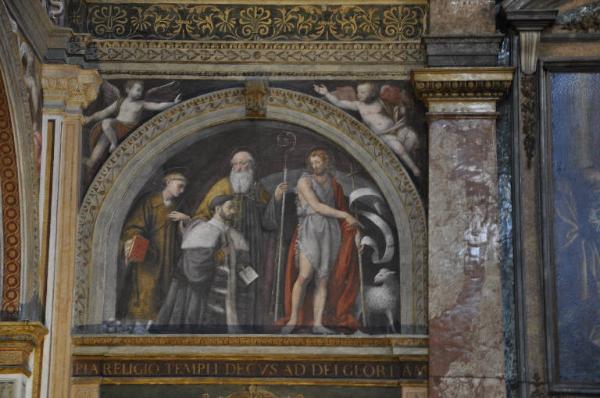 - NOTIZIE STORICO CRITICHE Alessandro Bentivoglio, insieme alla moglie Ippolita, fu il principale committente di una parte delle decorazioni della chiesa di San Maurizio. A parte una voce contraria, la critica è generalmente concorde nel riconoscere in questa lunetta la sua effige, come sembra confermare il confronto con gli altri ritratti, benché assai più giovanili rispetto a quello di San Maurizio (si veda la tela di Lorenzo Costa per la cappella Bentivoglio nella chiesa di San Giacomo a Bologna; gli studiosi hanno riconosciuto un'ulteriore effige del nobile bolognese nel profilo del pastore vestito all'antica e coronato di quercia nella pala Bentivoglio, eseguita da Francesco Francia nel 1498 per la chiesa della Misericordia a Bologna, oggi nella Pinacoteca Nazionale). In tutte le raffigurazioni viene sottolineata l'inclinazione di Alessandro per la poesia e per la musica, un aspetto, quest'ultimo, del tutto assente nel ritratto in San Maurizio. Non c'è dubbio, infatti, che le alterne fortune che colpirono la sua famiglia, costringendo molti esponenti all'esilio da Bologna, avessero segnato profondamente anche la vicenda privata del nobile. Dopo aver sposato Ippolita Sforza (raffigurata in un'altra lunetta della parete divisoria di San Maurizio), nel 1522 Alessandro divenne membro del Senato e nel 1529 fu insignito del titolo di viceduca (come conferma lo stemma dei Bentivoglio abbinato alla vipera viscontea adottata dagli Sforza). \nPer quanto riguarda la cronologia, l'affresco in esame cade in un momento non distante dal 1522, sulla base del fatto che proprio in tale data la figlia del Bentivoglio, Alessandra, divenne abbadessa del monastero di San Maurizio con il nome di Bianca. Il 1522 segnò anche l'entrata a Milano del duca Francesco Sforza, al cui seguito si era collocato Alessandro. La commissione degli affreschi, dunque, coincise con un momento di indubbia fortuna, anche economica, per la famiglia bolognese. Tale datazione funzione anche sul piano dello stile: in quell'anno, infatti, Agostino Busti il Bambaia terminò il monumento funebre Birago in San Francesco Grande a Milano, eseguendo un san Giovanni Battista che può aver rappresentato un precedente per quello inserito da Luini nella lunetta di San Maurizio. In quest'ultima (al pari della lunetta "gemella" con il ritratto di Ippolita Sforza) si osserva una maturazione del linguaggio del pittore, avvenuta nel senso di un maggiore senso dello spazio, accentuato dallo sfondamento illusionistico che sembra conferire spessore alla grandiosa parete, secondo una unità progettuale che dà luogo a una rappresentazione architettonica e teatrale insieme.