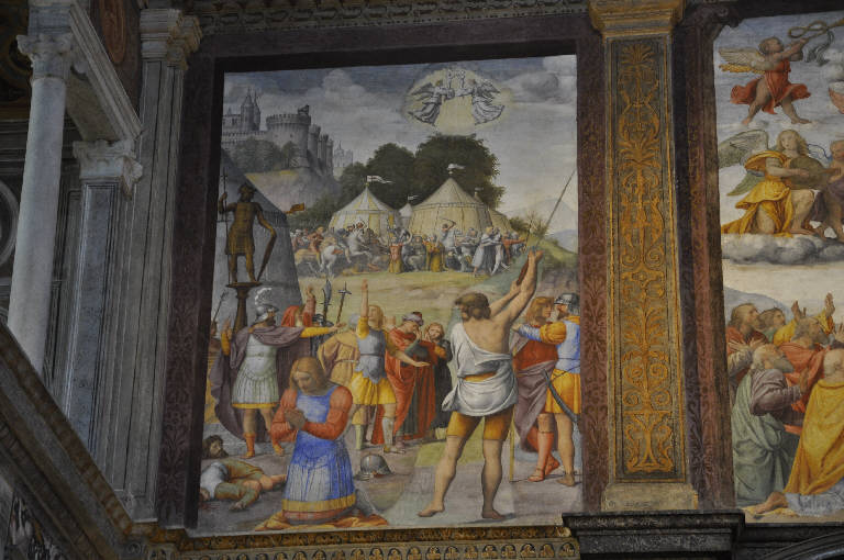 - NOTIZIE STORICO CRITICHE Dal punto di vista dell'impaginazione, qui si nota uno scarto rispetto alle sottostanti lunette con i ritratti dei committenti. Se queste ultime furono risolte attraverso una accentuazione della profondità spaziale, nel Martirio di san Maurizio, invece, come del resto anche nella scena sull'altro lato della parete divisioria (raffigurante San Sigismondo che offre il modello della chiesa a san Maurizio), l'illusionismo prospettico lascia il posto a una composizione che si sviluppa su diversi livelli, quasi si trattasse di episodi autonomi, collegati però dal medesimo tema e dalla presenza del paesaggio (in alto a sinistra, infatti, compare una straordinaria veduta che immortala un castello). Si riscontra, dunque, un maggiore intento narrativo, articolato secondo un registro espressivo che si serve di dettagli minuziosi e, al tempo stesso, di inseriti macabri, come i corpi decaptati e le teste mozzate, raffigurati in primo piano. La critica ha proposto, per questo affresco, una datazione leggermente più tarda rispetto a quella delle pitture dell'ordine inferiore della parete divisoria, eseguite intorno al 1522. La maturazione del linguaggio di Luini si evince soprattutto nei gesti eloquenti delle figure (si vedano, per esempio, i due personaggi sulla sinistra in secondo piano, uno dei quali indica la statua l'altro il cielo) e dal tono oratorio e declamatorio, che si avvale di precisi riferimenti raffaelleschi: giusto per fare un esempio, il carnefice di san Maurizio è simile, nella postura delle gambe, alla figura di spalle nella parte sinistra della Disputa del Sacramento, tra i più celebri affreschi di Raffaello presenti nelle Stanze vaticane.