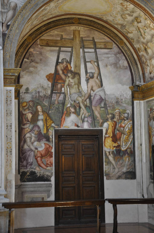 - NOTIZIE STORICO CRITICHE Gli affreschi della cappella di sinistra rappresentano una sintesi delle esperienze formative di Aurelio Luini, il principale protagonista della decorazione. Figlio minore di Bernardino Luini, a lungo attivo in San Maurizio nel terzo e quarto decennio del Cinquecento, Aurelio mostra il suo debito da una parte vero le influenze della maniera centro italiana, visibili nella monumentalità che contraddistingue la Deposizione al centro; dall'altra è evidente la matrice milanese della sua formazione e il rispetto per la lezione leonardesca, che qui viene puntualmente ripresa non soltanto nelle figure degli apostoli (trascritti in maniera fedelissima al celebre modello di Santa Maria delle Grazie), ma anche nell'inserto della figura barbuta in secondo piano a destra, memore delle caricature di Leonardo, che Aurelio certamente collezionava, come ricordava, alla fine del Cinquecento, il Lomazzo. La critica ha individuato alcune cadute di stile, imputabili all'intervento di collaboratori, probabilmente alla presenza, insieme ad Aurelio, del fratello maggiore Giovan Pietro Luini. Una datazione intorno al 1560-1565 è confortata dalla vicinanza stilistica di questi affreschi con quelli di Cairate. Alla scena della Deposizione è stato collegato un disegno conservato nell'Art Institute di Chicago (inv. 1943.1060R).\nPer quanto riguarda, invece, la paternità degli affreschi della cappella di destra, si riscontra una più netta separazione degli interventi, imputabili a Giovan Pietro e, solo marginalmente, ad Aurelio, autore però del bellissimo Putto reggicortina. La pittura di Giovan Pietro si caratterizza per una maggiore secchezza e per un disegno più insistito, che si evince per esempio dell'episodio di Cristo inchiodato alla croce.