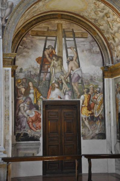 Il centro della cappella di sinistra presenta la Deposizione di Cristo, scena monumentale contraddistinta dagli astanti che calano dalla croce il corpo morto del Signore. Le pareti laterali sono affrescate con due gruppi di apostoli, raffiguranti stanti ma fedelmente ripresi da quelli dell'Ultima cena di Leonardo in Santa Maria delle Grazie a Milano. Sulla volta della cappella campeggiano vari putti in gloria (al centro c'era forse Dio Padre, oggi perduto), mentre sulla parete esterna della medesima cappella si trovano due Profeti con un cartiglio. \nLa cappella di destra conserva, nella lunetta, una scena raffigurante Cristo inchiodato alla croce; nella parete centrale, al di sotto della lunetta, è visibile un putto che sta scostando un tendaggio di colore verde; sulle pareti laterali sono presenti l'Ecce homo e l'Incoronazione di spine. Nei pennacchi dell'arco di accesso si trovano due Profeti, anch'essi recanti un cartiglio.
