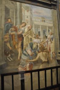 - NOTIZIE STORICO CRITICHE La scoperta di alcuni documenti (tra cui il contratto e i pagamenti) ha chiarito finalmente gli estremi cronologici dell'intervento di Simone Peterzano nella chiesa di San Maurizio, da circoscrivere tra il 1572 e il 1573. Ciò ha permesso, quindi, di collocare questi affreschi all'inizio dell'attività milanese del pittore bergamasco, appena rientrato dal suo tirocinio a Venezia, dove si guadagnò il titolo di "Ticiani alumnus", vale a dire di allievo di Tiziano. In effetti gli echi del mondo veneto sono decisamente presenti in tutte le prime prove milanesi di Peterzano, a cominciare dai due teleri della chiesa di San Barnaba (raffiguranti la Vocazione dei santi Paolo e Barnaba e I santi Paolo e Barnaba a Listri), sino alla Deposizione di San Fedele, proveniente dalla cappella della Veronica nella chiesa di Santa Maria della Scala, demolita nel 1776. In questo caso Peterzano sembra rifarsi in modo piuttosto esplicito a Tintoretto, per la capacità di imbastire scene contraddistinte da molte figure e da architetture in scorcio, che dunque creano fondali scenografici (queste ultime rese con un disegno preciso, trasmesso sull'intonaco attraverso l'incisione di un cartone); al tempo stesso il pittore sfoggia una indubbia abilità come narratore di scene intime e familiari, che avranno una notevole influenza sula formazione del giovane Michelangelo Merisi da Caravaggio, che, nel nono decennio del secolo, sarà un suo allievo.