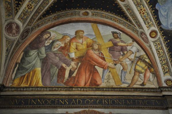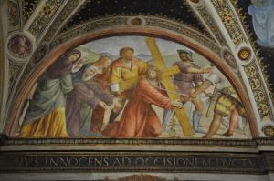 - NOTIZIE STORICO CRITICHE Come gran parte degli affreschi della parete divisoria della chiesa claustrale (eccettuate le Sante nel registro mediano e le scene dell'Ecce Homo e del Noli me tangere), le altre scene dedicate alla Passione di Cristo sono opera della bottega di Bernardino Luini. La loro datazione va quindi circoscritta negli ultimi anni di attività del maestro, morto nel 1532. Bernardino., evidentemente, pur ideando le composizioni non fece in tempo a realizzarle compiutamente. L'elevato numero di figure e soprattutto la loro difficile articolazione all'interno di uno spazio piuttosto limitato, quale quello della lunetta, sono elementi che escludono l'autografia luinesca. Bernardino, tuttavia, dovette riservarsi il ruolo di ideatore degli episodi, traendo spunti dalle stampe: la Vergine, per esempio, è ripresa in controparte da quella nello Spasmo di Sicilia di Raffaello, un'opera tarda del pittore di Urbino morto nel 1520. Ciò conferma una cronologia piuttosto dilatata nel tempo e certamente non troppo precoce.