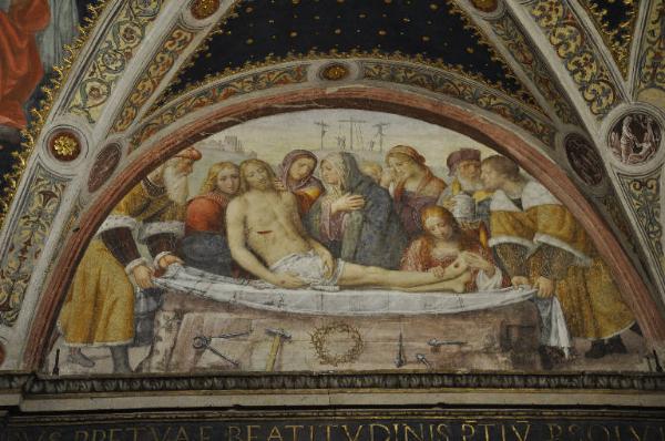 - NOTIZIE STORICO CRITICHE L'affresco denota, sul piano dell'esecuzione tecnica, un livello qualitativo non eccelso, tuttavia in linea con la maggior parte della decorazione che contraddistingue la parete divisioria della chiesa claustrale. Questa considerazione, che trova sostegno nell'annalisi ravvicinata dell'intonaco e, soprattutto, nel ductus pittorico, invita a prendere in considerazione la possibiltà che questo settore, al pari dell'altra lunetta con il Cristo portacroce, vada riferita all'intervento della bottega, subentrata in modo sempre più consistente nell'ultimo periodo di attività di Bernardino Luini, proseguendone l'opera dopo la morte avvenuta nel 1532. Non c'è dubbio, in ogni caso, che l'idea di partenza fosse stata predisposta da Bernardino in persona, come conferma del resto l'analogia del gruppo del Cristo con quello presente al centro della cappella del Corpus Domini nella chiesa di San Giorgio al Palazzo a Milano.