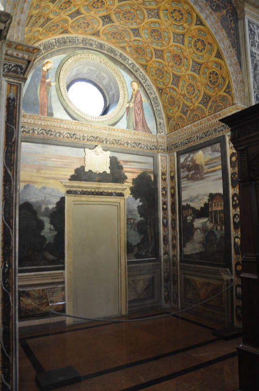 - NOTIZIE STORICO CRITICHE Non è dato sapere chi sia l'autore di queste scene di paesaggio, che mostrano una disparità qualitativa imputabile alla partecipazione di diverse maestranze. Sembrerebbe, in ogni caso, plausibile individuare un pittore esperto nella illustrazione di paesaggi e di ampie vedute paesaggistiche, restituite con indubbia attenzione nei confronti dei dettagli, secondo una modalità che potrebbe essere accostata a certi stilemi di ambito nord europeo. E' probabile, però, che l'anonimo maestro impegnato in San Maurizio (e affiancato, come detto, da una cospicua bottega) fosse di formazione lombarda.