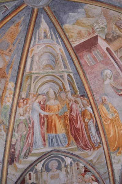 - NOTIZIE STORICO CRITICHE I protagonisti di questo episodio mariano hanno per molti aspetti mantenuto l'integrità cromatica originaria, percepibile nella qualità delle varie gradazioni presenti, contraddistinte da toni luminosi di rosa, viola, grigi, azzurri, verdi e gialli. La scena denota il linguaggio di Masolino, che si attesta su due livelli espressivi tra di loro in equilibrio: da una parte la ricerca di eleganza formale, percepibile nell'uso della linea, fluida e morbida, dei panneggi delle figure che ricadono in terra formando ampie volute; dall'altra una sensibilità cromatica che non aveva pari nella pittura lombarda della prima metà del Quattrocento (se si eccettua l'attività di Michelino da Besozzo e il passaggio bresciano di Gentile da Fabriano). E' stato osservato che Masolino dovette avere presenti i rilievi della Porta del Paradiso di Lorenzo Ghiberti, da cui dipendono, negli affreschi della Collegiata, i rapporti tra le figure e le architetture, la cadenza ritmica dei panni e dei gesti, il modo assorto dei personaggi di partecipare all'azione. A Castiglione emergono dunque i ricordi fiorentini dell'artista, compreso, certamente, il retaggio della collaborazione, sia pur breve, che nel terzo decennio del Quattrocento aveva avviato con Masaccio, morto a Roma nel 1428. Alla lezione masaccesca si deve, infatti, l'approfondimento chiaroscurale dei volti, tuttavia ancora debitori della tradizione tardogotica. L'architettura di sfondo, che delinea uno splendido edificio traforato, è stata riferita alla mano del senese di Masolino, Lorenzo di Pietro detto il Vecchietta.