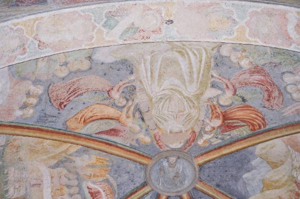 La vela presenta una morfologia sostanzialmente diversa dalle altre cinque che compongono la volta del coro. Il suo formato, allungato ma in senso orizzontale, viene qui utilizzato per ambientare un episodio che in realtà richiederebbe uno sviluppo verso l'alto, quale è l'Assunzione di Maria Vergine. Quest'ultima è assisa su di un trono e circondata da varie schiere angeliche, che la stanno sollevando in cielo. La problematica compositiva è dunque risolta in questo modo. Ai lati ulteriori presenza angeliche, racanti cartigli oggi illeggibili, completano la scena.