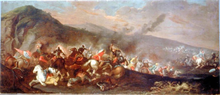 - NOTIZIE STORICO CRITICHE Come ha osservato l'estensore della scheda cartacea, il dipinto proviene dal legato di Maria Teresa Acchiappati Gandolfi, erede di un ramo della famiglia comense dei Giovio, ma esso non trova corrispondenza nel relativo elenco conservato presso l'Archivio dei Musei Civici. \nLa scena di battaglia rappresenta uno scontro roboante di cavalieri tanto da sollevare al centro agglomerati turbinosi di polvere. \nL'ignoto autore sembra ispirarsi all'opera di Antonio Calza per l'impostazione complessiva della scena, caratterizzata da contrappunti spaziali tra primi e secondi piani. Tuttavia, diversamente dal pittore veronese, mostra scarsa attenzione per la definizione delle piccole figure sul fondo e rivela, nei gruppi in primo piano, una certa rigidità disegnativa.