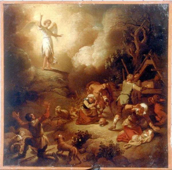 - NOTIZIE STORICO CRITICHE Il quadro fu sequestrato nel 1945 ad una tale Adele Soncini di Milano.\nL'estensore della scheda cartacea ha rilevato che "se la matrice fiamminga e la datazione alla metà del Seicento per questo dipinto è indubbia, meno probante sembra la paternità a questo artista [David Teniers], e per una certa ingenuità di esecuzione, soprattutto nelle figure dei pastori, che sono delineate abbastanza rozzamente, e per una generale durezza della pennellata, che si eleva a risultati più sciolti ed eleganti nella figura dell'angelo e in tutta la parte alta del quadro [...]"