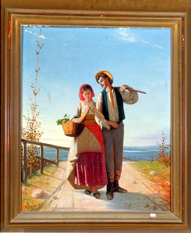 Il dipinto raffigura una coppia di giovani contadini che rientrano dai campi dopo una giornata di lavoro. Alle loro spalle si apre il paesaggio della Brianza, in cui si intuisce la presenza dei laghi della zona di Erba, illuminati dalla luce calda del tardo pomeriggio. L'accento del quadro è posto sul sentimento amoroso che lega i due protagonisti della tela, colti dal pittore con uno sguardo di tenera partecipazione, che idealizza la dura vita dei campi affrontata quotidianamente dai due giovani e la trasfigura in un simbolo universale dell'amore. Il quadro è opera del pittore Giuseppe Reina, appartenente a una nota famiglia della nobiltà comasca. La sua produzione pittorica, concentrata soprattutto sulle tematiche risorgimentali, sul ritratto e sui soggetti di genere con personaggi tratti dalle classi sociali più umili è fortemente segnata dall'esempio di Domenico Induno, di cui fu allievo a Milano.\n\nLa provenienza del dipinto risulta ignota. D'altra parte il Barbera (Barbera, 1991, 988) ha rilevato che "ad eccezione di alcune sue opere conservate in raccolte pubbliche (Catania, Napoli), gran parte della produzione del Reina [...] risulta dispersa". \nCome ha annotato l'estensore della scheda cartacea: "C. Reina [fu] un tardoromantico allievo di C. Morelli a Napoli. Alcuni titoli delle sue opere più note