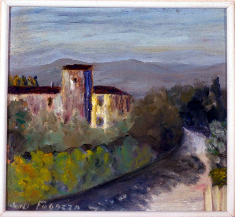 Un vecchio caseggiato, sulla sinistra, è racchiuso da un muro, a sua volta fiancheggiato da una strada, a destra. Sullo sfondo si vedono montagne.