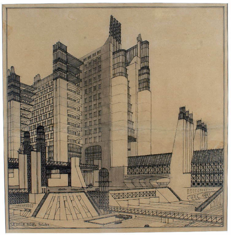 - NOTIZIE STORICO CRITICHE La tavola fu esposta alla mostra del gruppo Nuove Tendenze svoltasi a Milano presso la Famiglia Artistica nella primavera del 1914. Subito dopo fu pubblicata insieme ad altri cinque disegni analoghi nel Manifesto dell'Architettura Futurista redatto dallo stesso Sant'Elia e datato 11 luglio 1914. La tavola, che nel Manifesto è intitolata "La città futurista - Casamento con ascensori esterni, galleria, passaggio coperto, su 3 piani stradali (linea tramviaria, strada per automobili, passerella metallica", è un esempio emblematico delle ricerche di Sant'Elia sul tema della città moderna, concepita come un sistema metropolitano complesso e caratterizzato da un'estetica architettonica improntata alla pura funzionalità, aliena dai modelli decorativi tipici dello stile Liberty. Fu acquistata nel 1943 presso la famiglia Sant'Elia per iniziativa di Manlio Rho e Gianni Stecchini e donata l'anno successivo al Comune di Como.