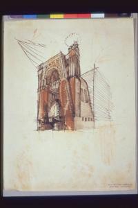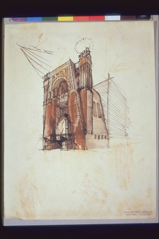 - NOTIZIE STORICO CRITICHE E' noto, attraverso testimonianze dirette (l'arch. G.U. Arata) e segnalazioni su giornali ("La sera", Milano, 19 ottobre, 1916), che Sant'Elia partecipò al concorso nazionale bandito il 1° febbraio 1914 per la nuova chiesa di Salsomaggiore: ma per mancanza di precise indicazioni sui fogli dell'archivio santeliano non è possibile stabilire con certezza quali siano i disegni dedicati a tale finalità. Questo e i disegni inv. nn. A 359- A 361, che, paiono riferirsi al tema ecclesiale, vengono quindi collegati solo per ipotesi al concorso, che, in seconda edizione si concluse con l'assegnazione del premio e dell'incarico esecutivo all'architetto G.U. Arata.