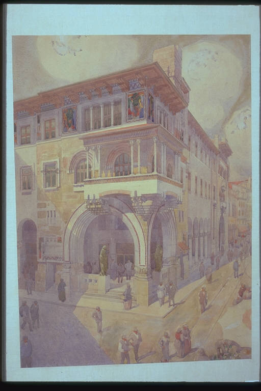 - NOTIZIE STORICO CRITICHE Il 15 giugno 1913 venne bandito un concorso internazionale per la nuova sede della Cassa di Risparmio di Verona in Piazza delle Erbe, con la prescrizione ai concorrenti di non creare dissonanze con gli edifici adiacenti, inserendosi armonicamente nel composito ambiente urbano senza alterarne la fisionomia. L'architetto Arrigo Cantoni partecipò con un'equipe di collaboratori scelti nell'ambito di competenze diverse, fra i quali Antonio Sant'Elia e il pittore Leonardo Dudreville. Il progetto dello studio Cantoni, presentato con il motto "Costruire", si classificò tra i cinque finalisti: ma la giuria non ritenne nessun lavoro soddisfacente e invitò gli autori ad una seconda prova più aderente alle condizioni del bando. Sant'Elia e Cantoni ripresentarono il progetto con modifiche senza però ottenere miglior successo. Nel dicembre 1914 fu infatti proclamato vincitore l'architetto G.B. Milani.
