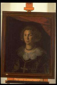 - NOTIZIE STORICO CRITICHE La Zecchinelli (vd. fonti archivistiche) indica che il dipinto proviene dalla collezione Olginati, ma non vi è nessun riscontro possibile con l'inventario dei dipinti di questa famiglia. Ritengo che il n.32 che si legge sull'etichetta sul retro della cornice, nonchè la scritta "Fabbriceria della Cattedrale", possano indicare che l'opera apparteneva alla Cattedrale e che vene lasciata in deposito presso il Museo agli inizi del XX secolo. Infatti nell'Archivio dei Musei Civici di Como, in Miscellanea, fasc.6, Verbale di ricognizione di oggetti d'arte in custodia, 1903, al n.29 è indicato un ritratto di donna stile 1600 che si dice essere collocato nella Sala Ricami al primo piano. Potrebbe essere il nostro ritratto, anche se una verifica nel catalogo Sala Ricami non ha avuto esito positivo in questo senso.