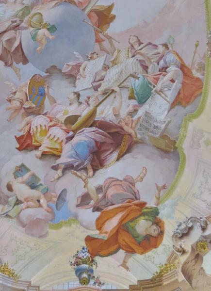 Grande medaglia affrescata al centro della volta ribassata del salone d'onore, dal profilo ovale con l'inserzione di modanature. Oltre la finta volta dipinta si apre uno squarcio sul cielo, popolato di putti volanti e di fanciulle in sontuosi abiti, personificazioni delle arti e delle scienze, riconoscibili per i rispettivi attributi iconografici. Il primo gruppo di donne è seduto su un'ampia nuvola, più in alto stanno altre due figure, appoggiate ad un grande globo. All'apice del cielo la personificazione della Verità che sale leggera sempre più su. All'opposto, dalle nuvole precipita una donna bendata, simboleggiante l'Ignoranza.