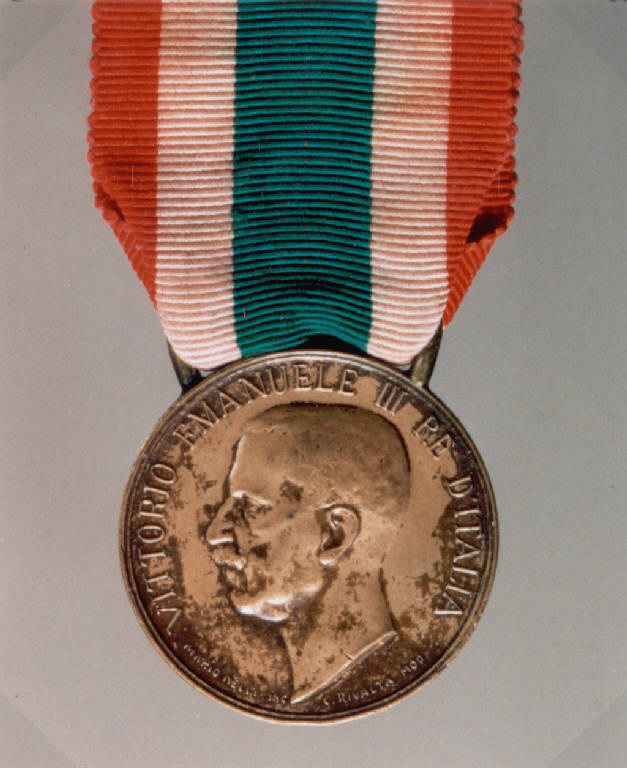 R: RITRATTO DI VITTORIO EMANUELE III; V: CORONA D'ALLORO. R: EFFIGIE VIRILE PROFILO SINISTRO, ISCRIZIONE; V: CORONA DI DUE RAMI D'ALLORO LEGATI IN BASSO DA UN NASTRO DOPPIO, ISCRIZIONE