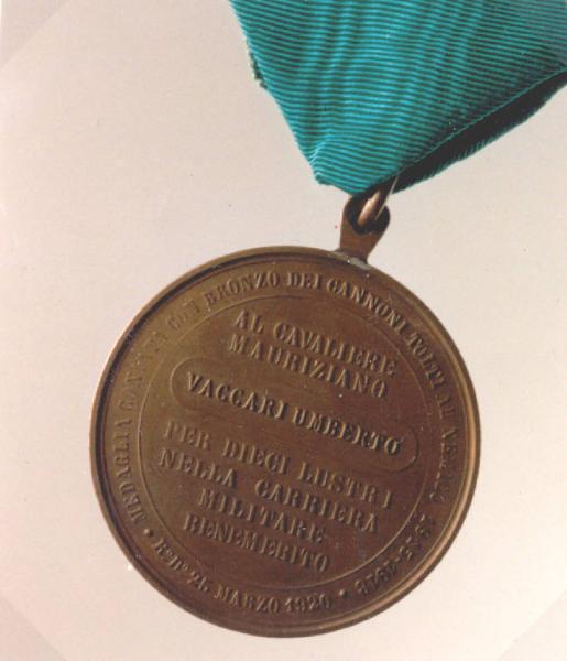 - NOTIZIE STORICO CRITICHE PERIODO STORICO: REGNO D'ITALIA\nDATA MERITO: 1895-1945\nEVENTO: DIECI LUSTRI NELLA CARRIERA MILITARE\nNOME INSIGNITO: VACCARI UMBERTO\nQUALIFICA: COLONNELLO\nLUOGO EVENTO: \nLUOGO E DATA CONFERIMENTO: ROMA, 12 DICEMBRE 1945\n\nSI RAMMENTA CHE L'INCISORE FERRARIS GIUSEPPE E' MORTO NEL 1869