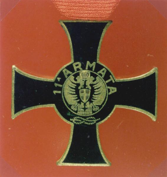 LA CROCE HA I BRACCI CENTINATI, RACCORDATI AL CENTRO DA UNO SCUDO CIRCOLARE, SMALTATA SUL RECTO DI NERO. IL NASTRO E' ROSSO