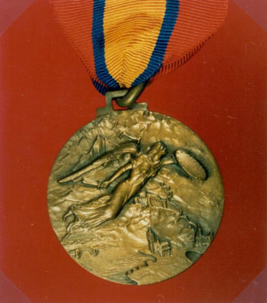 R: VITTORIA ALATA CHE VOLA SOPRA I CONFINI NORD-ORIENTALI DELL'ITALIA. R: FIGURA FEMMINILE ALATA CON SCUDO NELLA SINISTRA E GLADIO NELLA DESTRA CHE SORVOLA, PROVENIENDO DAL MARE, UNA CRESTA CONCLUSA DA UNA MURAGLIA; V: UN'AQUILA IN ATTO DI SPICCARE IL VOLO DA UN MUCCHIO DI ARMI DA TAGLIO E DA FUOCO, ISCRIZIONE