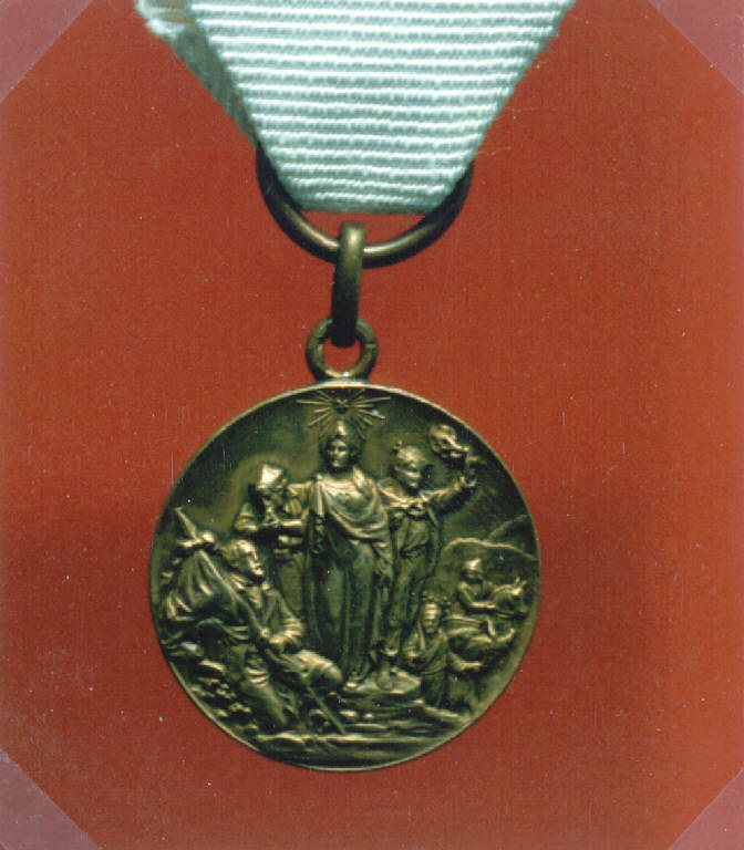 R: ALLEGORIA DELLA CROCE ROSSA SOCCORRITRICE; V: AQUILA SABAUDA, CROCE DI GINEVRA, CORONA VEGETALE. R: TESTA FEMMINILE TURRITA, PROFILO DESTRO, ISCRIZIONE; V: NUDO VIRILE CON SCUDO CHE SI SCIOGLIE DALL'ABBRACCIO MULIEBRE, ISCRIZIONE