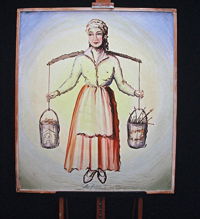 - NOTIZIE STORICO CRITICHE L'affresco rappresenta una contadina, vestita in abito tradizionale, che porta una bilancia fatta a giogo con due sacchi in uno è contenuto il paese di Arcumeggia e nell'altro dei pennelli.