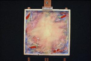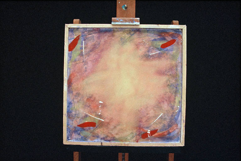 Affresco eseguito su formella di truciolato ricoperta di intonaco con intelaiatura in legno.