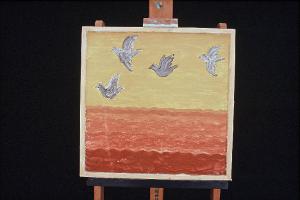 - NOTIZIE STORICO CRITICHE Volo di 4 uccelli di colore azzurro, su uno sfondo di cielo giallo ed in basso una serie di pennellate color ocra rossa che paiono onde del mare.