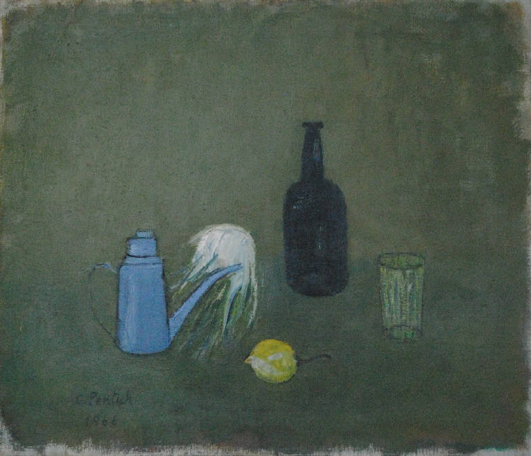 Su un fondo verde scuro si riconoscono, partendo da sinistra, una caraffa, un finocchio, un limone, una bottiglia e un bicchiere.
