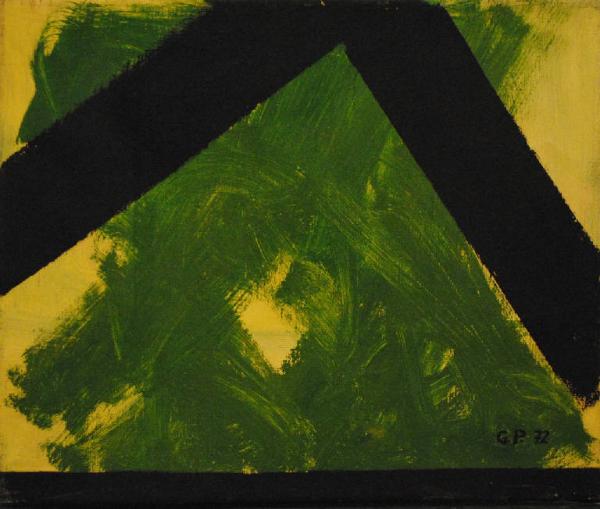 Su un fondo prevalentemente verde due segmenti neri si incrociano quasi ad angolo retto nella parte alta della tela.
