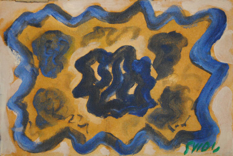 L'opera è contenuta in un blocco Fabriano e rappresenta un soggetto astrattro in cui, su un fondo giallo ocra, una linea spezzata blu racchiude macchie e linee del medesimo colore.
