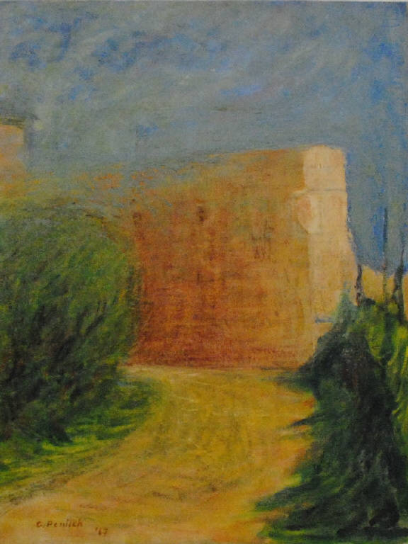 L'opera raffigura uno scorcio di stradina di campagna chiuso, sul fondo, dalla struttura stilizzata di un caseggiato.