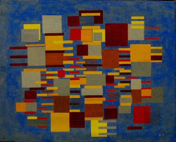 L'opera presenta una sottile cornice di legno. Composizione d'invenzione di ispirazione mondrianea articolata in una serie di piccoli superfici quadrate e rettangolari grigie, arancioni, bordeaux e gialle su fondo azzurro.