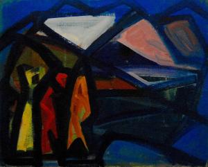 Composizione d'invenzione la cui superficie totale è ripartita in aree minori da linee assimilabili alle intelaiature di metallo delle vetrate; all'interno, ogni porzione di superficie è campita da cromie differenti (rosa, giallo, bianco, azzurro). Nell'insieme, l'opera sembra raffigurare i profili di tre personaggi che procedono su uno sfondo paesaggistico con alture.