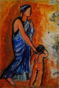 L'opera raffigura, su fondo rosso, la forma plastica di una donna, con tunica azzurra e velo per capelli dello stesso colore, mentre protende la propria mano verso il volto di un bambino nudo visto da tergo.