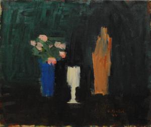 L'opera, alla maniera delle soluzioni pittoriche di Nicolas de Staël, raffigura un vaso blu contenente fiori rosa, un bicchiere bianco e una bottiglia rosa su fondo verde.