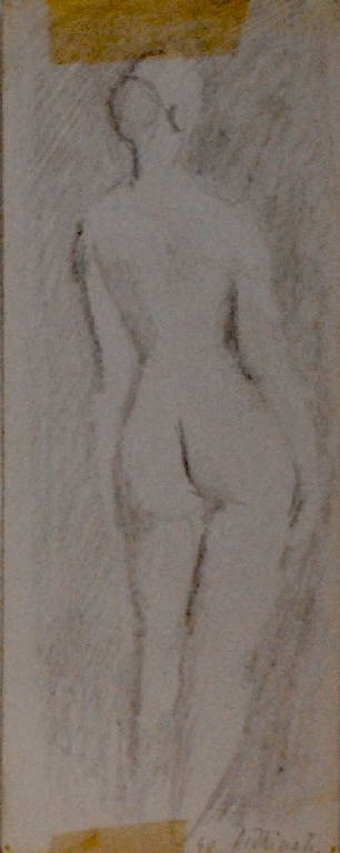 Il supporto cartaceo, di recupero, è un foglio a stampa tratto da un libro di riproduzioni d'arte. Il disegno raffigura il corpo nudo di una donna da tergo.