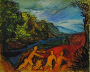 Composizione raffigurante un paesaggio naturale, con piante e corso d'acqua e, in primo piano, tre figure umane nude stilizzate.