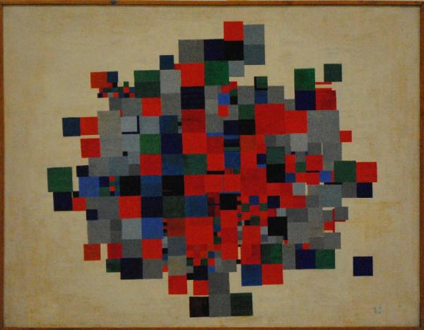 L'opera presenta una sottile cornice di legno danneggiata agli angoli. Composizione d'invenzione di ispirazione mondrianea con colori dominanti rossi e blu su fondo chiaro.