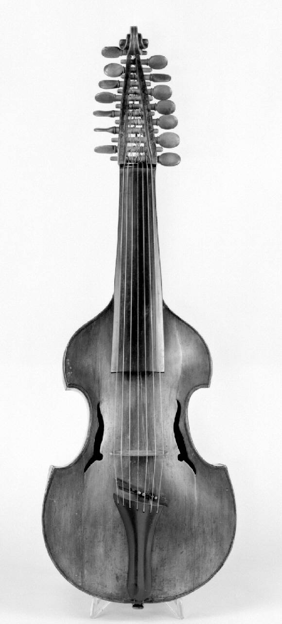 Strumento costruito a copia, con segni di invecchiamento artificiali. Il fondo e la tavola hanno i bordi a filo delle fasce. Il fondo è piatto in un solo pezzo di acero con angolo superiore. Le fasce sono dello stesso legno. La tavola è in abete. I fori armonici sono a forma di fiamma. Nella parte superiore della tavola, sotto la tastiera, è incastrata una rosetta intagliata in stile vagamente gotico. La testa è in acero e termina con una chiocciola. Il manico è trattenuto da due chiodi metallici piantati nel tassello superiore, dove sono chiaramente visibili le teste. Le controfasce interne sono in acero, di dimensioni ridotte. Sul fondo sono montate due catene e una placca dell'anima in abete; l'angolo nella parte superiore del fondo è ricoperto da una striscia di pergamena. Il filetto, presente solo sulla tavola, ha il bianco in pioppo di 0,6 mm e il nero di legno malamente tinto (noce?) di 0,6 mm. La tastiera è in acero lastronato di ebano, la cordiera è in ebano massiccio. La vernice originale è di color marrone chiaro, presente solo sulla testa, mentre tutta la cassa è ricoperta da una vernice moderna di color rosso bruno. Lo strumento monta sette corde tastabili e sette di risonanza, che partono direttamente dalla tavola, nella quale è inserita una lastrina in ebano.